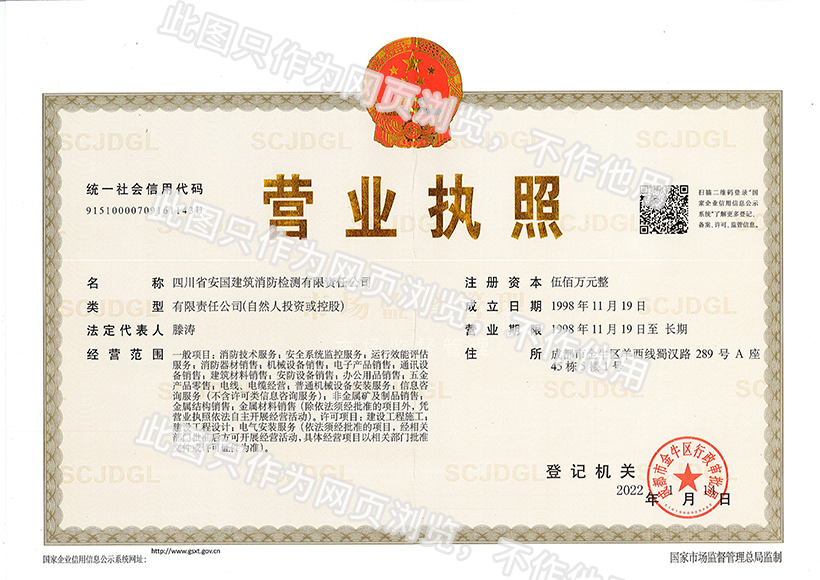 四川省安國建筑消防檢測有限責任公司,成立于1998年,經(jīng)四川省公安消防總隊批準,工商部門注冊的獨立法人單位。 公司具有建筑消防設(shè)施檢測、電氣防火安全檢測、維修、保養(yǎng)及技術(shù)咨詢一級資質(zhì)的中介技術(shù)服務(wù)機構(gòu),獲得CMA計量認證。主要業(yè)務(wù)范圍是:接受建設(shè)單位或有關(guān)單位委托,承擔新建、改建、擴建建筑自動消防設(shè)施技術(shù)檢測、電氣防火安全檢測、以及承接建筑消防設(shè)施維護保養(yǎng),對已交付使用的建設(shè)消防設(shè)施的運行情況進行運行檢測,開展建筑消防設(shè)施的消防安全技術(shù)咨詢。公司設(shè)辦公室、總工辦、財務(wù)部、檢測部、維保部等職能機構(gòu),擁有一